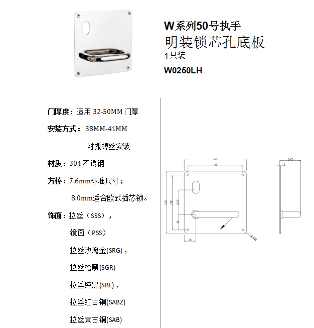 W系列表50號執手 明裝鎖體孔底板